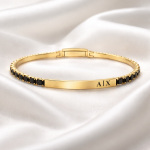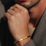 Modeli kombinon metalin gold me gurë të zinj të vendosur vetëm në pjesën e jashtme, duke krijuar një kontrast elegant dhe modern. Pjesa e brendshme është metal i lëmuar për rehati maksimale gjatë mbajtjes.