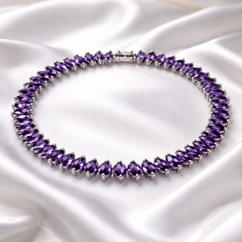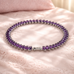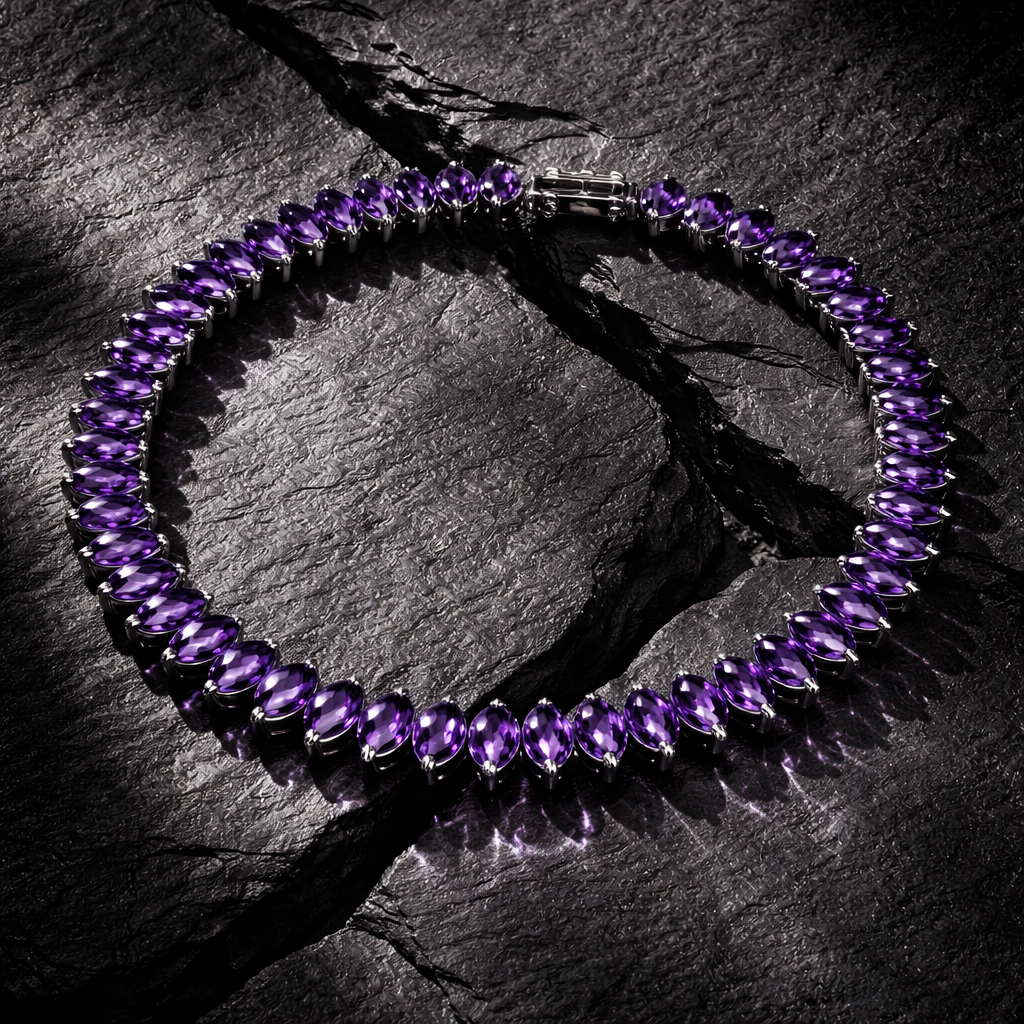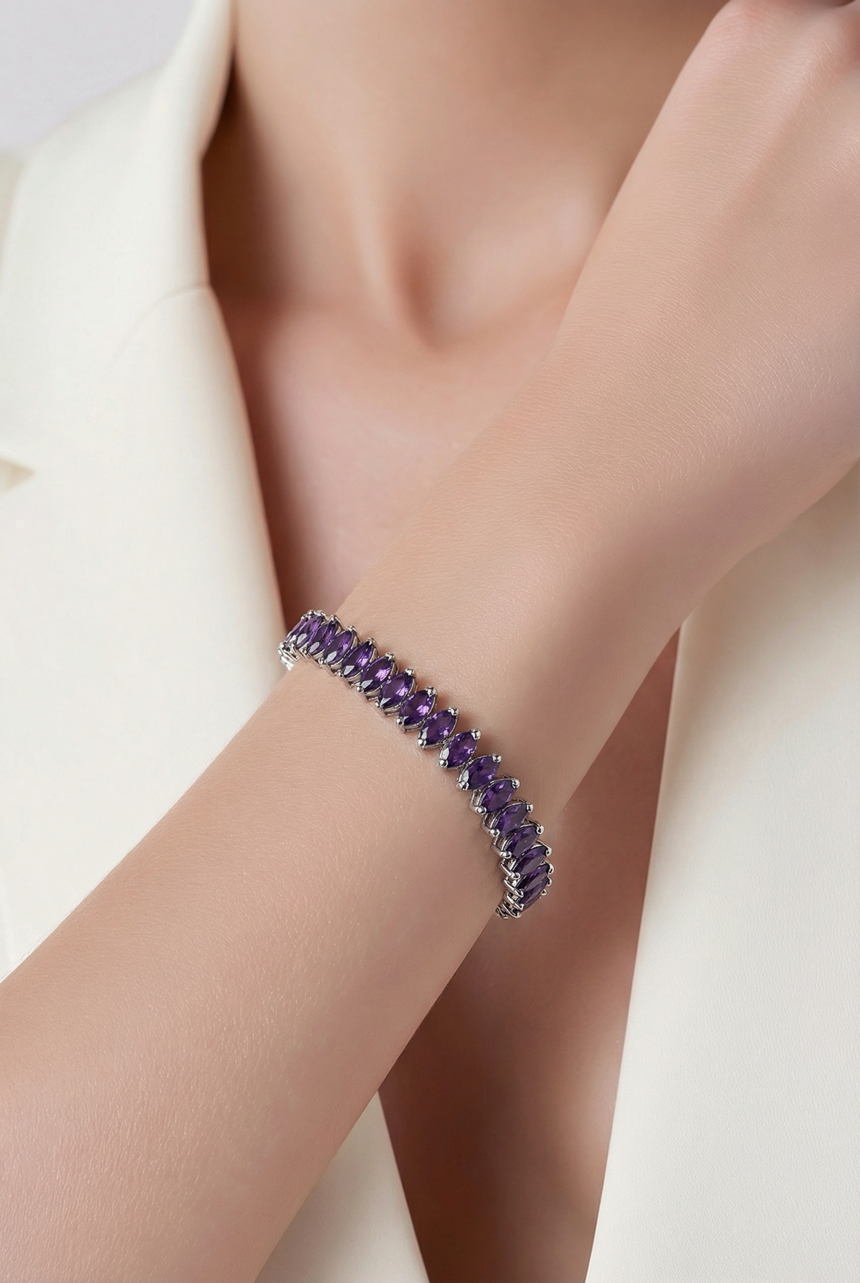 Kjo dorëzore elegante është e dizajnuar me gurë zirkon në formë “marquise” me nuancë vjollcë intensive, të vendosur në mënyrë perfekte përgjatë gjithë gjatësisë së saj. Prerja precize e gurëve reflekton dritën në mënyrë mahnitëse, duke krijuar një efekt luksoz dhe shumë të sofistikuar.