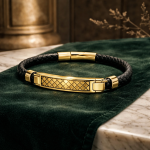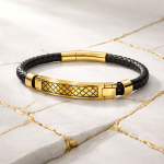 Kjo dorëzore elegante kombinon lëkurën e zezë të gërshetuar me elemente çeliku inox në ngjyrë gold, duke krijuar një pamje të fuqishme dhe të sofistikuar. Pllaka qendrore me dizajn të punuar në detaje i jep karakter dhe personalitet çdo kombinimi veshjeje.