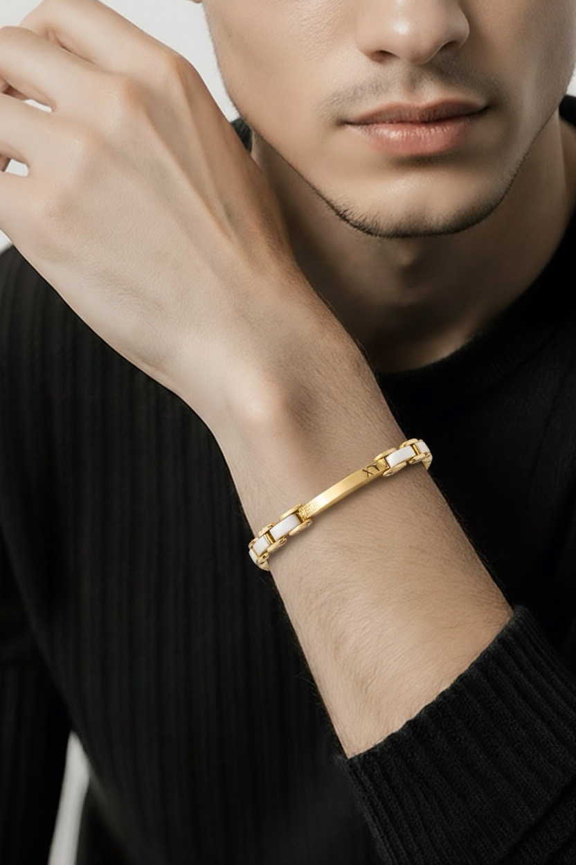 Dorzore elegante dhe moderne nga Armani Exchange, e dizajnuar me kombinim unik të çelikut të larë në gold dhe elementeve të bardha keramike.