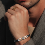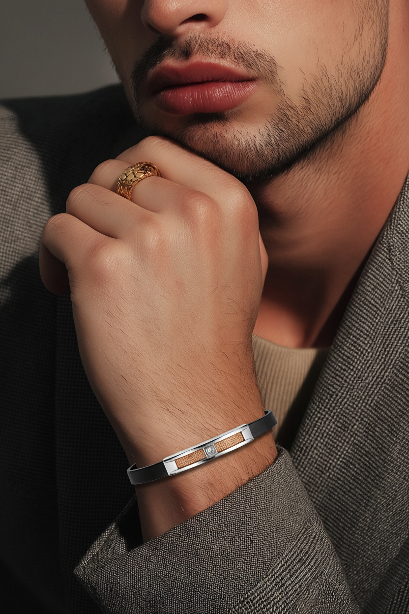 Dorzore elegante me rrip të zi minimalist dhe strukturë metalike silver, e kombinuar me detaj teksture rose gold dhe gur qendror dekorativ. Dizajn modern, i hollë dhe mashkullor – ideal për stil të përditshëm dhe kombinime smart-casual.