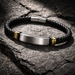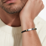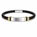 Dorzore moderne e punuar nga lëkurë natyrale e zezë e gërshetuar, e kombinuar me pllakë qendrore prej çeliku inoks (stainless steel) me finish mat. Detajet anësore gold i japin pamje premium dhe elegante.
