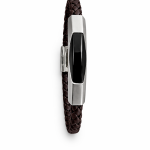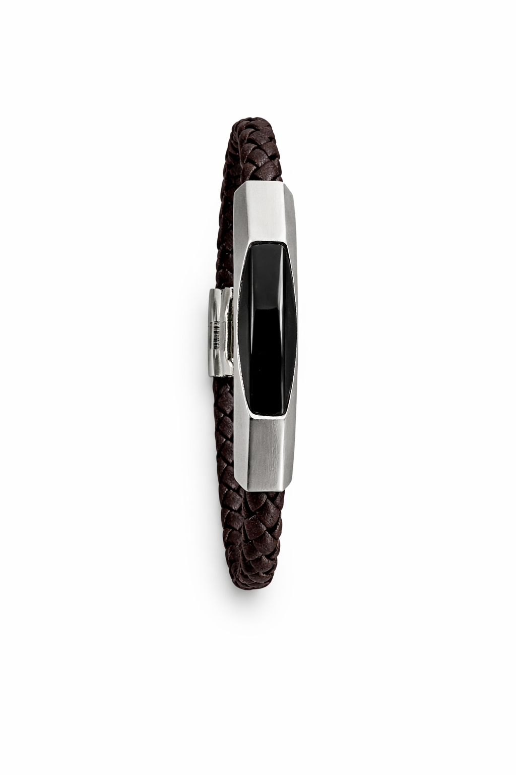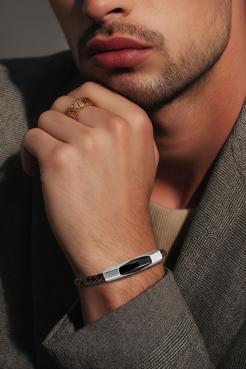 modern. Kjo dorëzore për meshkuj është e punuar me lëkurë të gërshetuar në ngjyrë kafe të errët, e kombinuar me element metalik në ngjyrë silver dhe detaj qendror në black me shkëlqim elegant.
