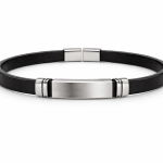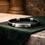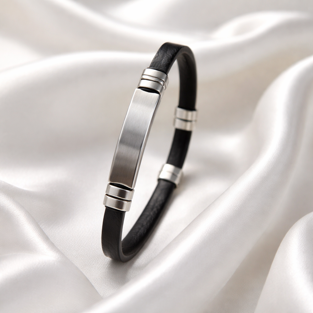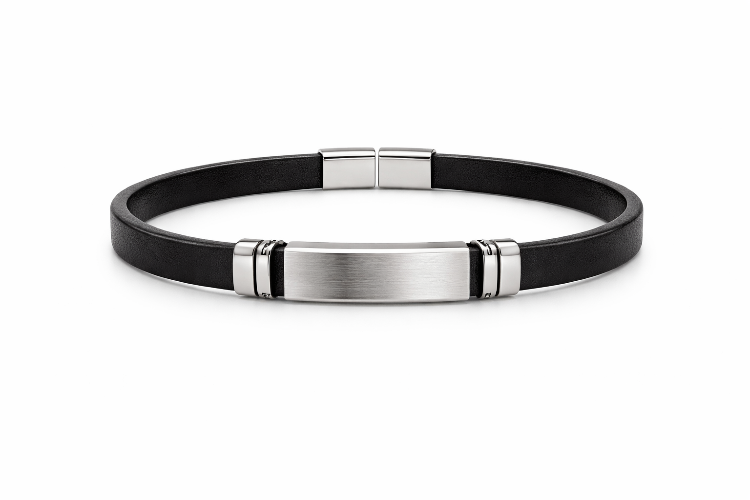 Dorzore elegante me lëkurë natyrale të zezë dhe pllakë qendrore nga çelik inoks me përfundim brushed (mat), që i jep një pamje moderne dhe premium.