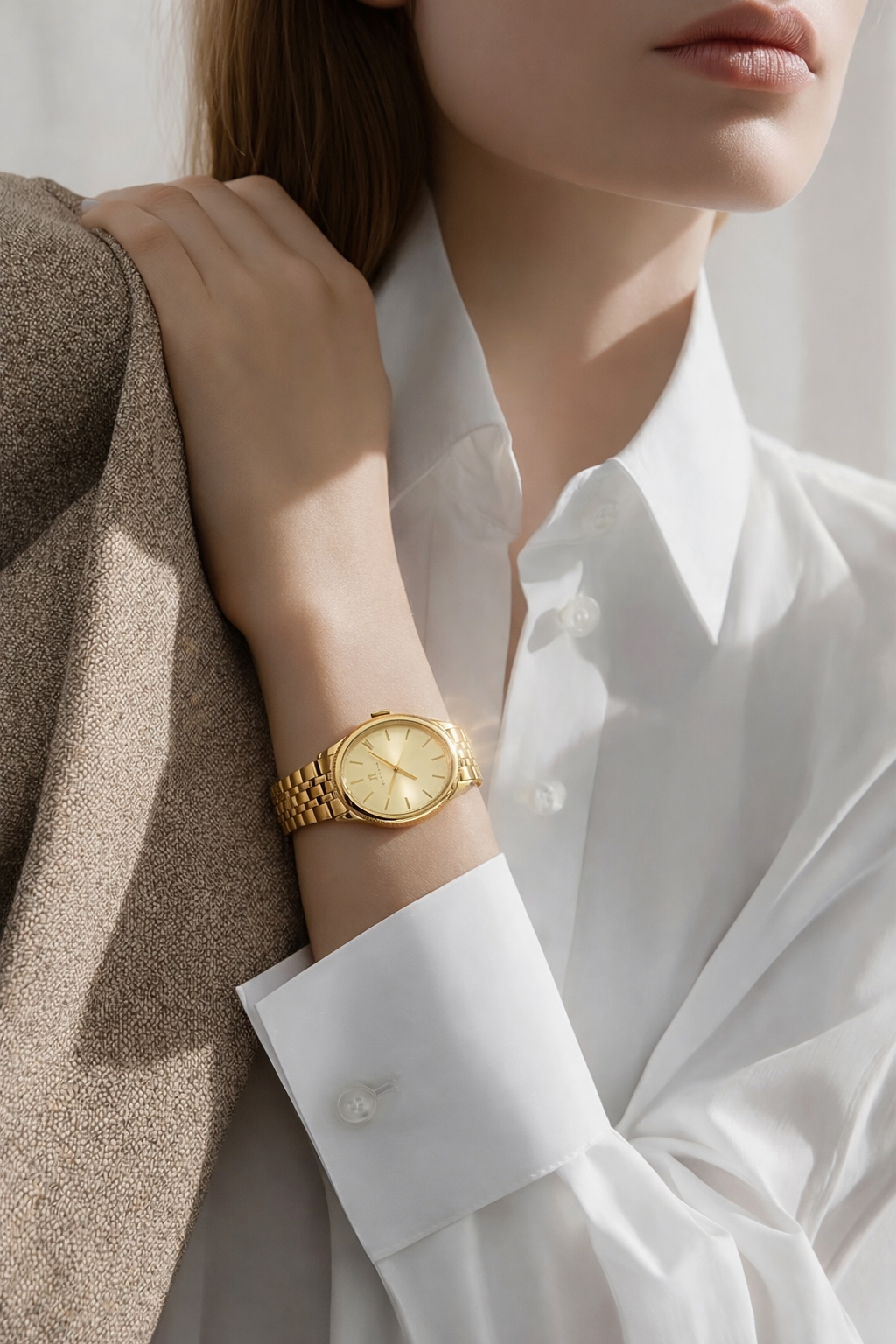 Rripi metalik stainless steel në ngjyrë gold siguron komoditet dhe qëndrueshmëri, duke e bërë këtë model ideal për përdorim të përditshëm dhe për raste speciale.