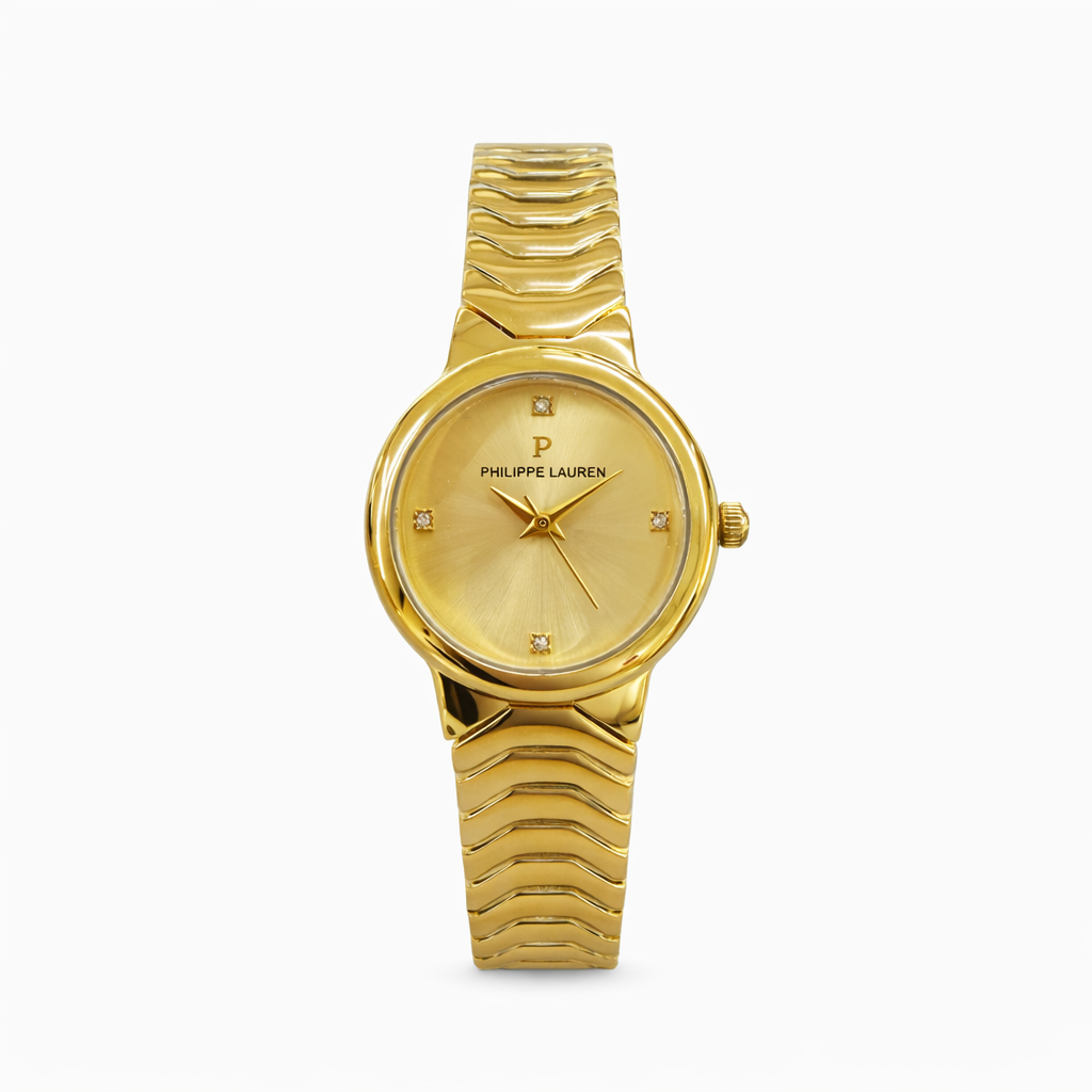 Ora elegante Philippe Lauren Gold Crystal është simbol i stilit dhe elegancës. Me një dizajn luksoz në ngjyrë gold dhe me kristale të vendosura në cadran, kjo orë i shton një prekje sofistikuese çdo veshjeje.