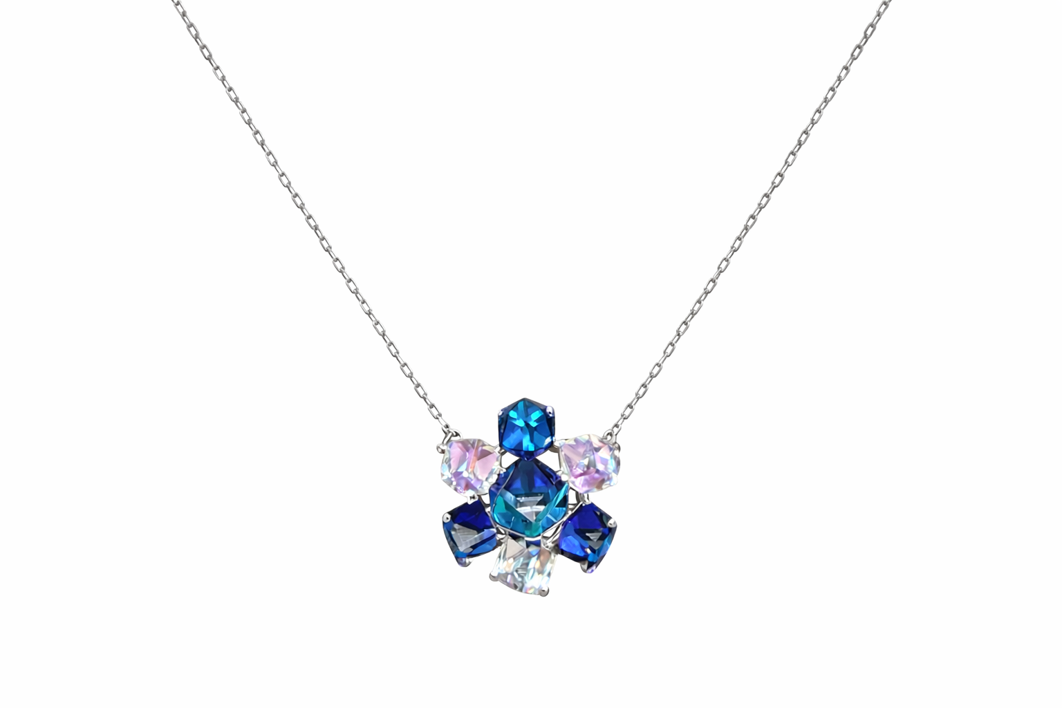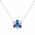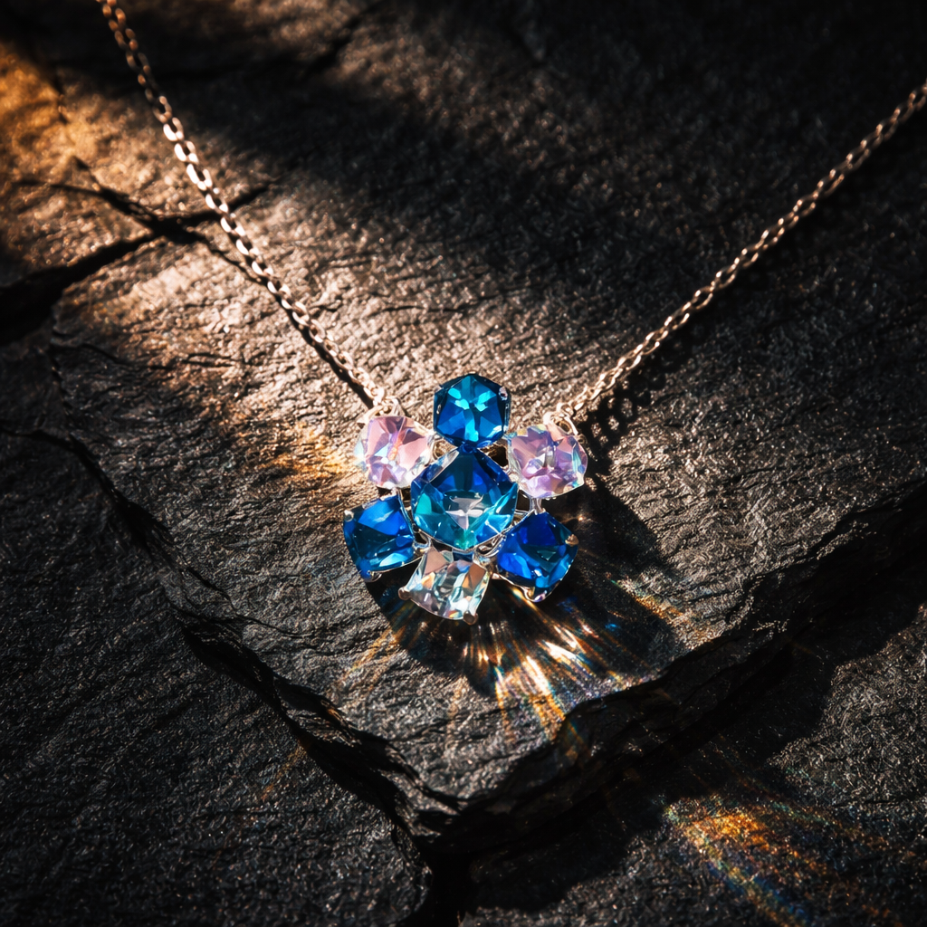 Kjo qafore elegante është një aksesor i veçantë që i shton shkëlqim çdo veshjeje. E dizajnuar me kristale të bukura në nuanca blu, rozë dhe transparente, ajo krijon një reflektim të mrekullueshëm të dritës dhe një pamje luksoze.