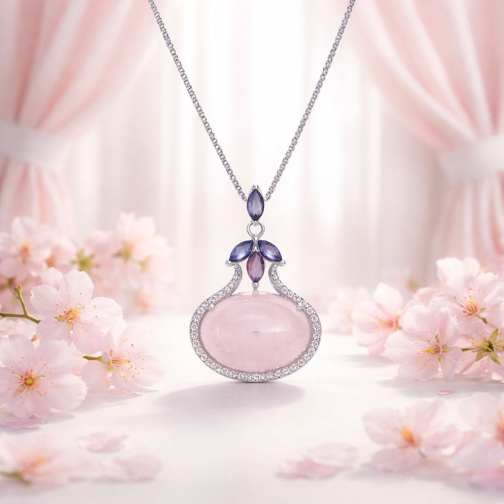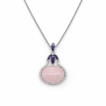 Qafore elegante me dizajn të veçantë dhe shumë femëror, e zbukuruar me një gur të madh Rose Quartz në ngjyrë rozë të butë që simbolizon elegancën dhe delikatesën. Detajet me kristale vjollcë dhe rrethimi me kristale zirkon i japin kësaj qafore një shkëlqim luksoz dhe shumë tërheqës.