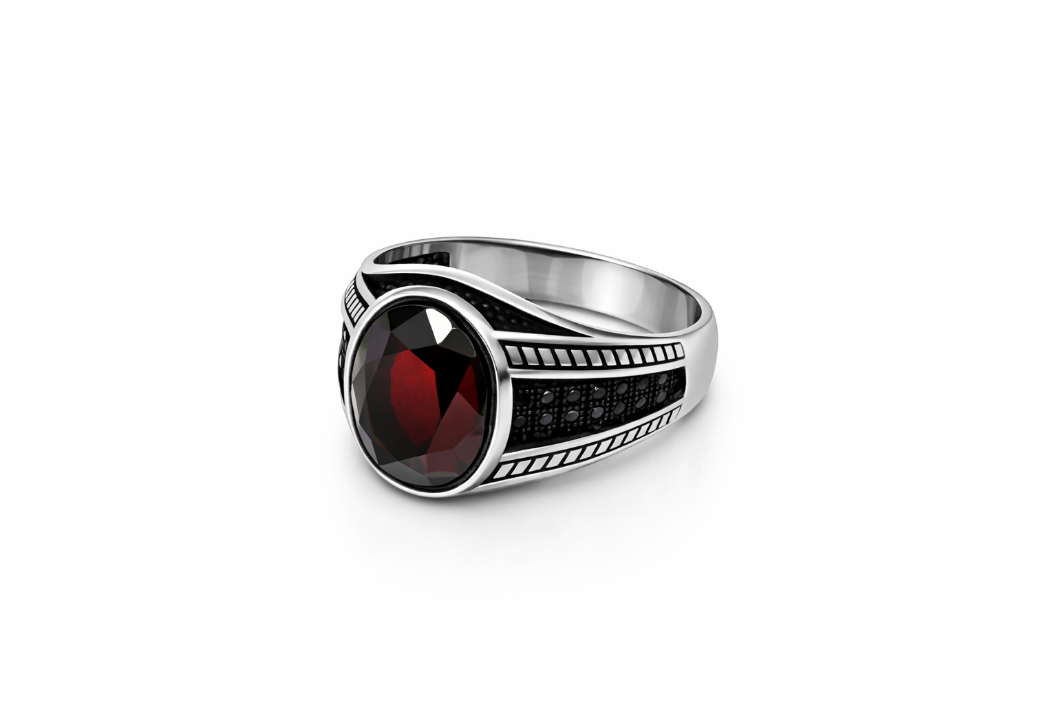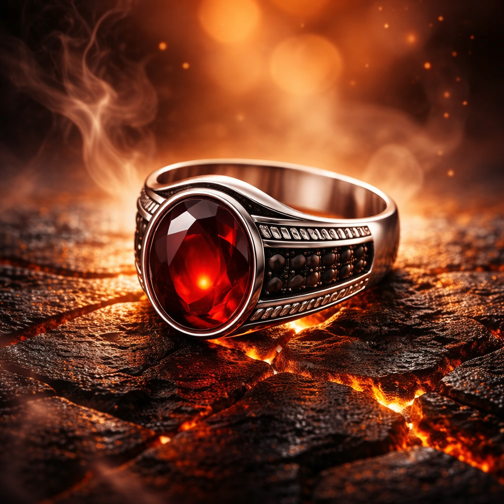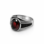 Unazë Silver 925 me gur vishnje oval me prerje elegante që reflekton dritën në mënyrë të veçantë. Dizajni i punuar me detaje në anët e unazës krijon një pamje klasike dhe shumë të fuqishme.
