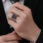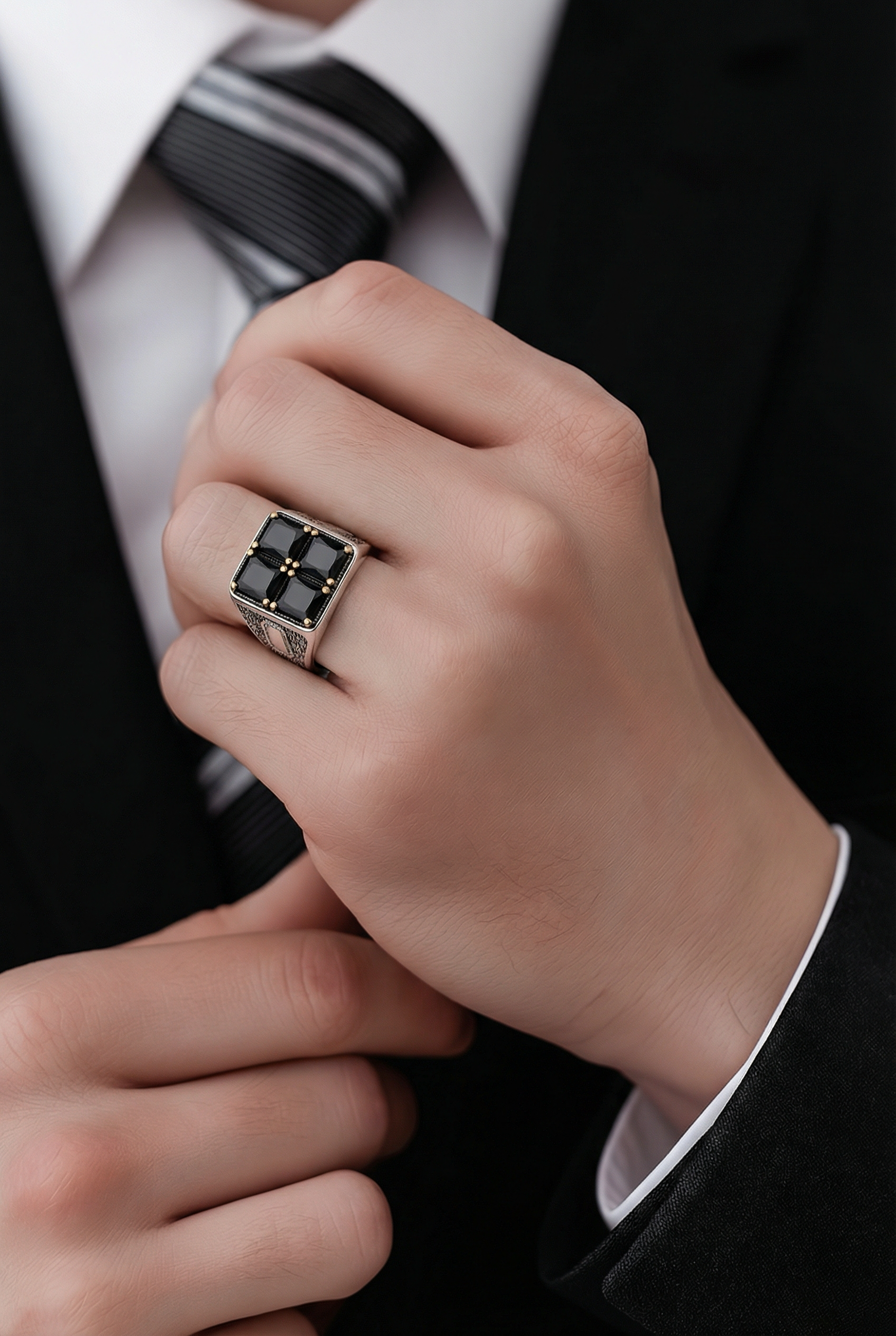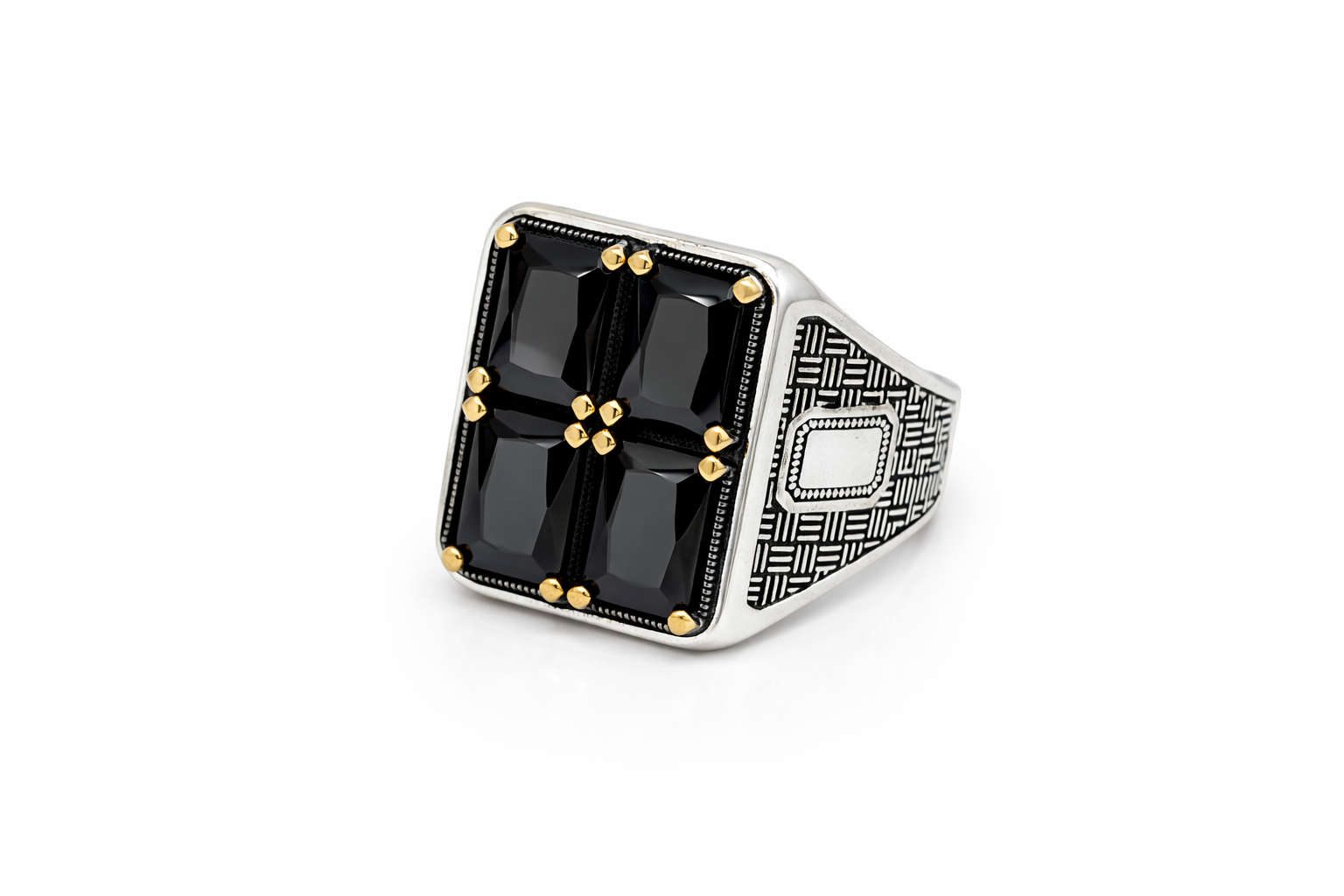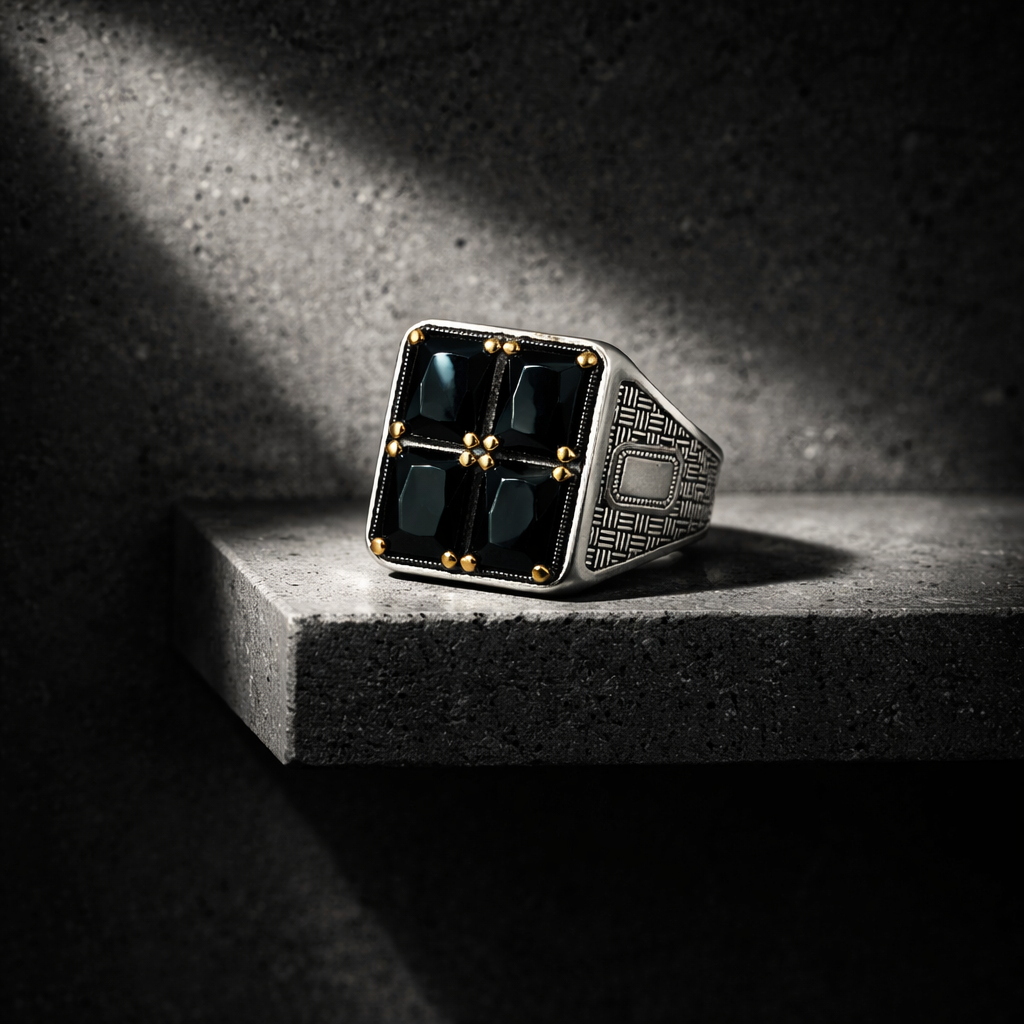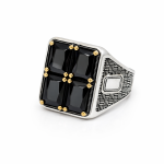 Unazë elegante Silver 925 me dizajn katror dhe 4 gurë të zinj të prerë me shumë faqe për një shkëlqim të theksuar. Detajet e arta në kapëset e gurëve dhe punimi i veçantë anësor i japin unazës një pamje luksoze, moderne dhe maskuline.