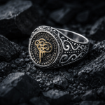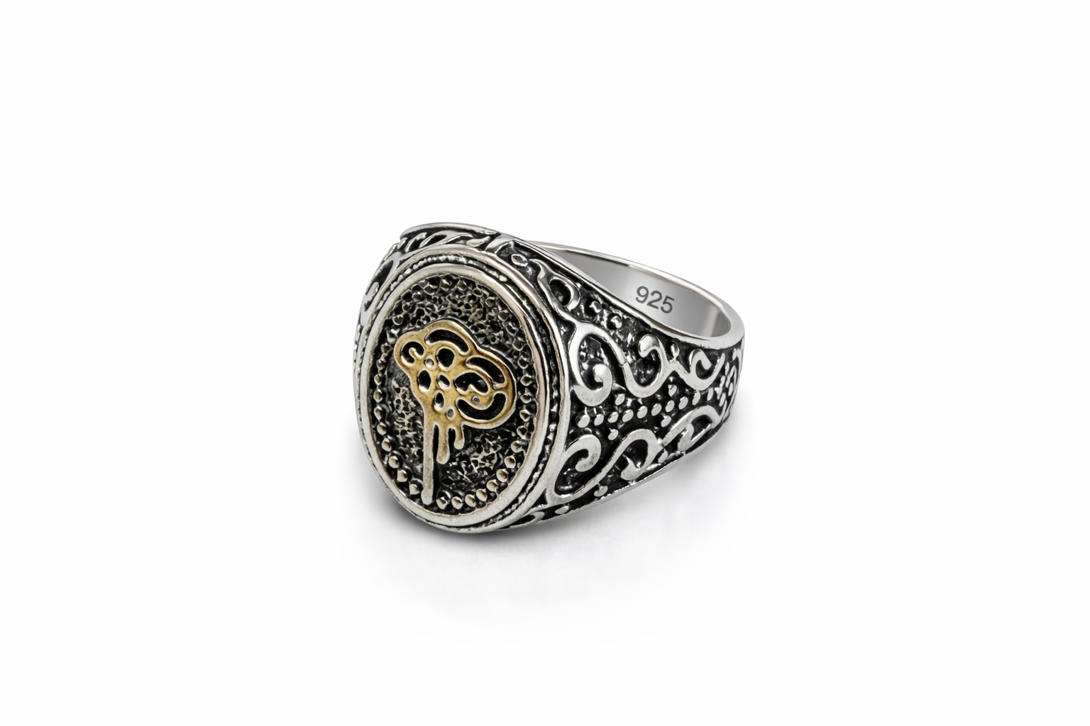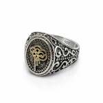 Unazë Silver 925 me dizajn të veçantë dhe simbol tradicional në pjesën qendrore. Detajet e punuara në anët e unazës dhe tekstura e pasur i japin një pamje shumë elegante dhe me karakter.