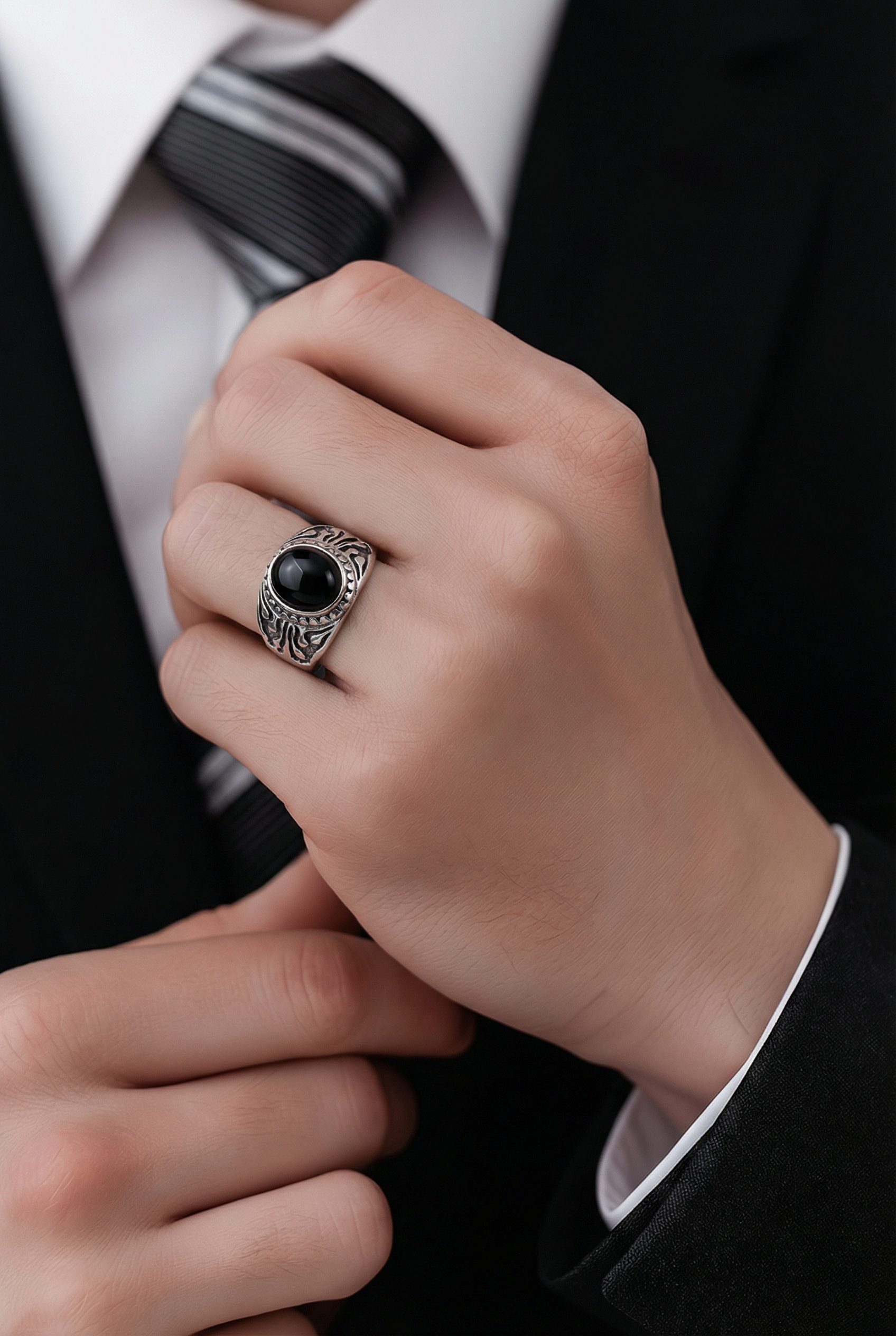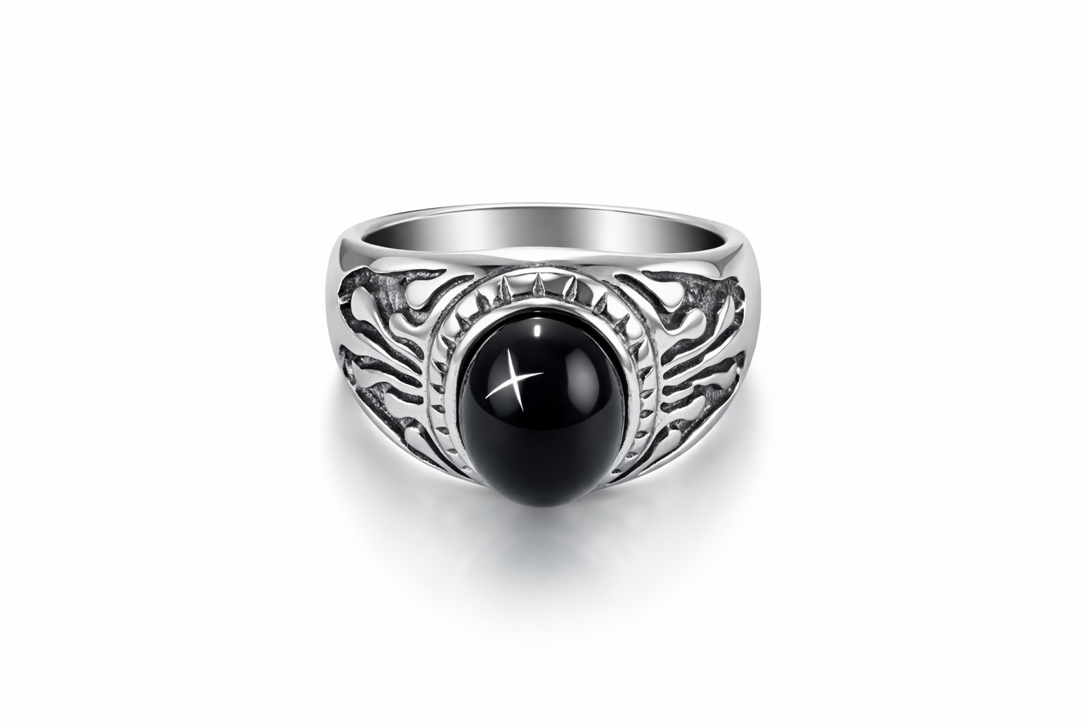 Një model unik unaze silver me gur të zi të theksuar që i jep një pamje të fortë dhe shumë elegante. Dizajni i punuar me detaje në anët e unazës krijon një stil modern dhe të veçantë, perfekt për ata që duan të dallohen.
