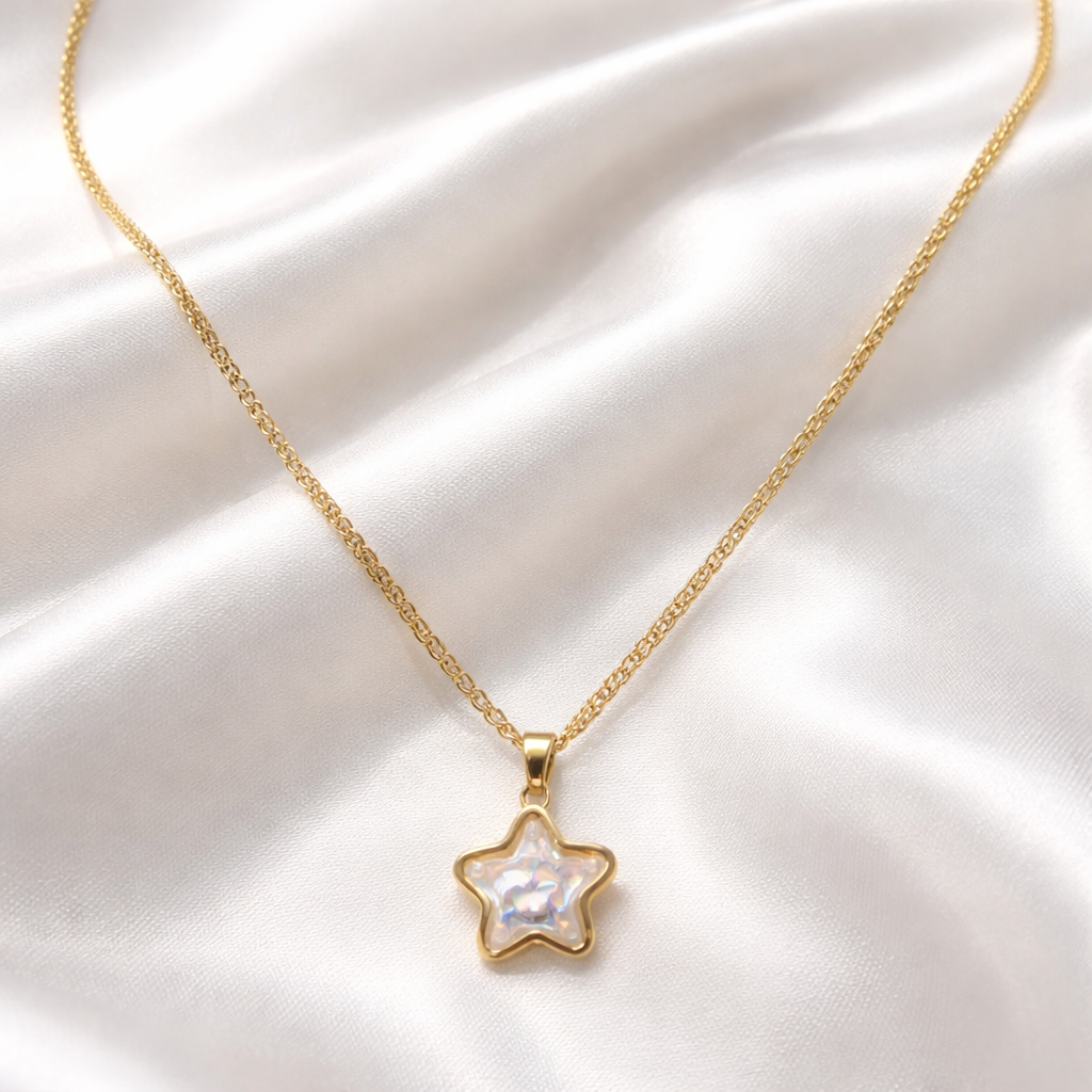Një varëse magjike që bashkon shkëlqimin e yjeve me finesën klasike të perlave. Dizajn elegant dhe femëror, ideal për t’i dhënë dritë çdo veshjeje – nga dita në mbrëmje.