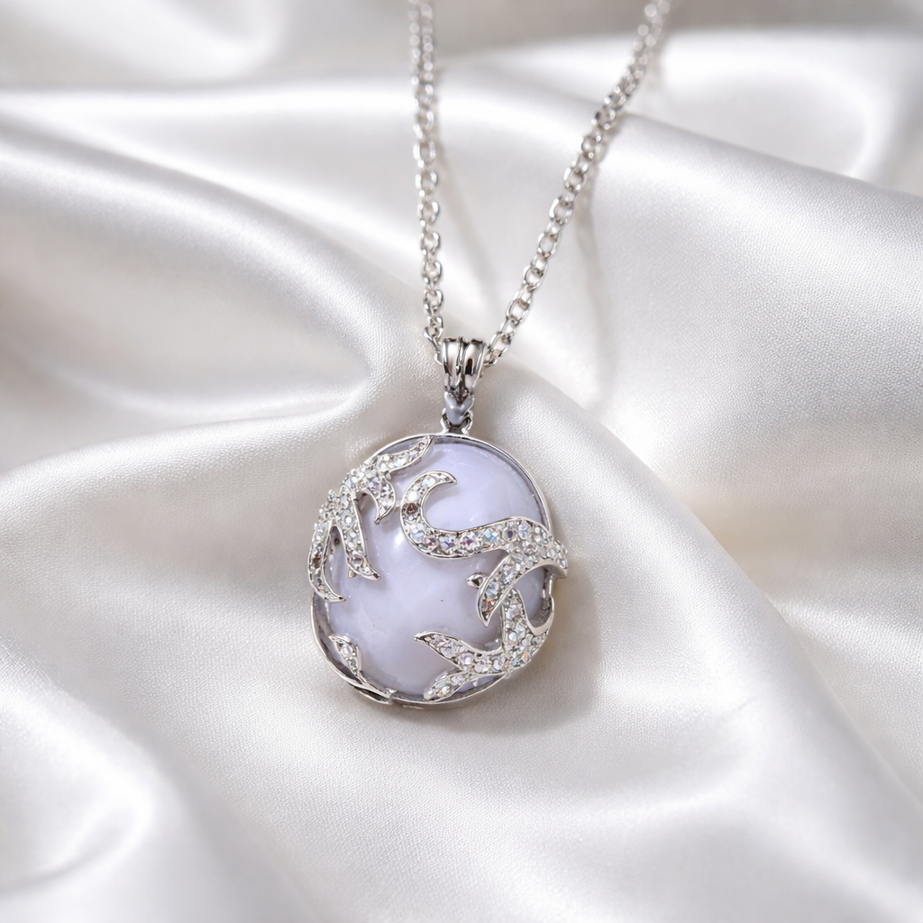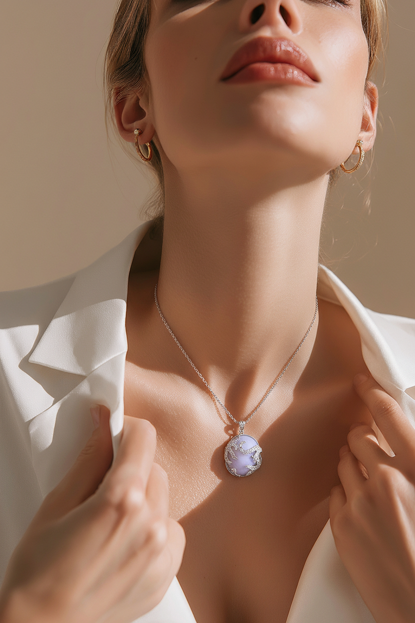 Një dizajn i veçantë që kombinon delikatesën me simbolikën. Varësja me formë të rrumbullakët, e zbukuruar me gur në nuancë të butë vjollcë dhe detaje të kristalizuara, krijon një pamje të sofistikuar dhe moderne.