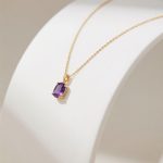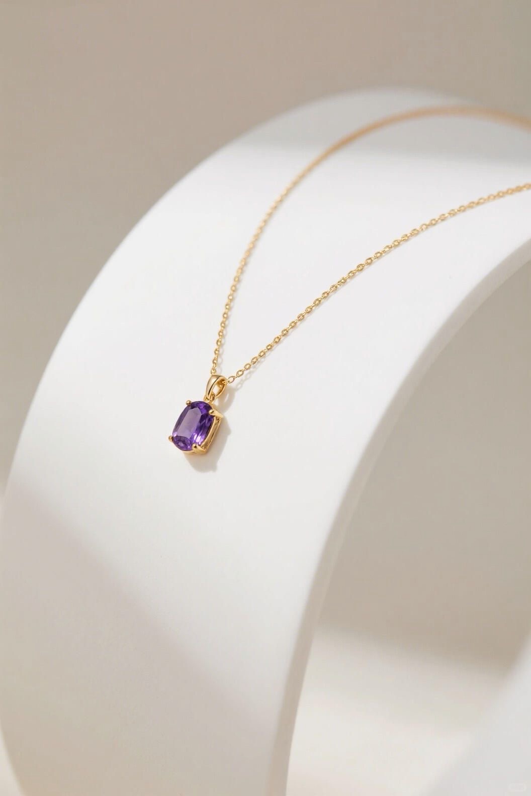 Një varëse delikate me zinxhir të hollë gold dhe gur vjollcë me shkëlqim elegant, e dizajnuar për të theksuar finesën dhe stilin femëror. Forma klasike e gurit dhe prerja e pastër krijojnë një pamje luksoze, ideale për kombinime ditore apo mbrëmje speciale.
