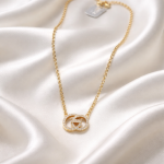 Një model elegant me dizajn modern që reflekton stil dhe klas. Kjo varëse gold me simbol të ndërthurur dhe e dekoruar me gurë zirkon të kristalizuar sjell një shkëlqim të rafinuar në çdo paraqitje.
