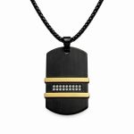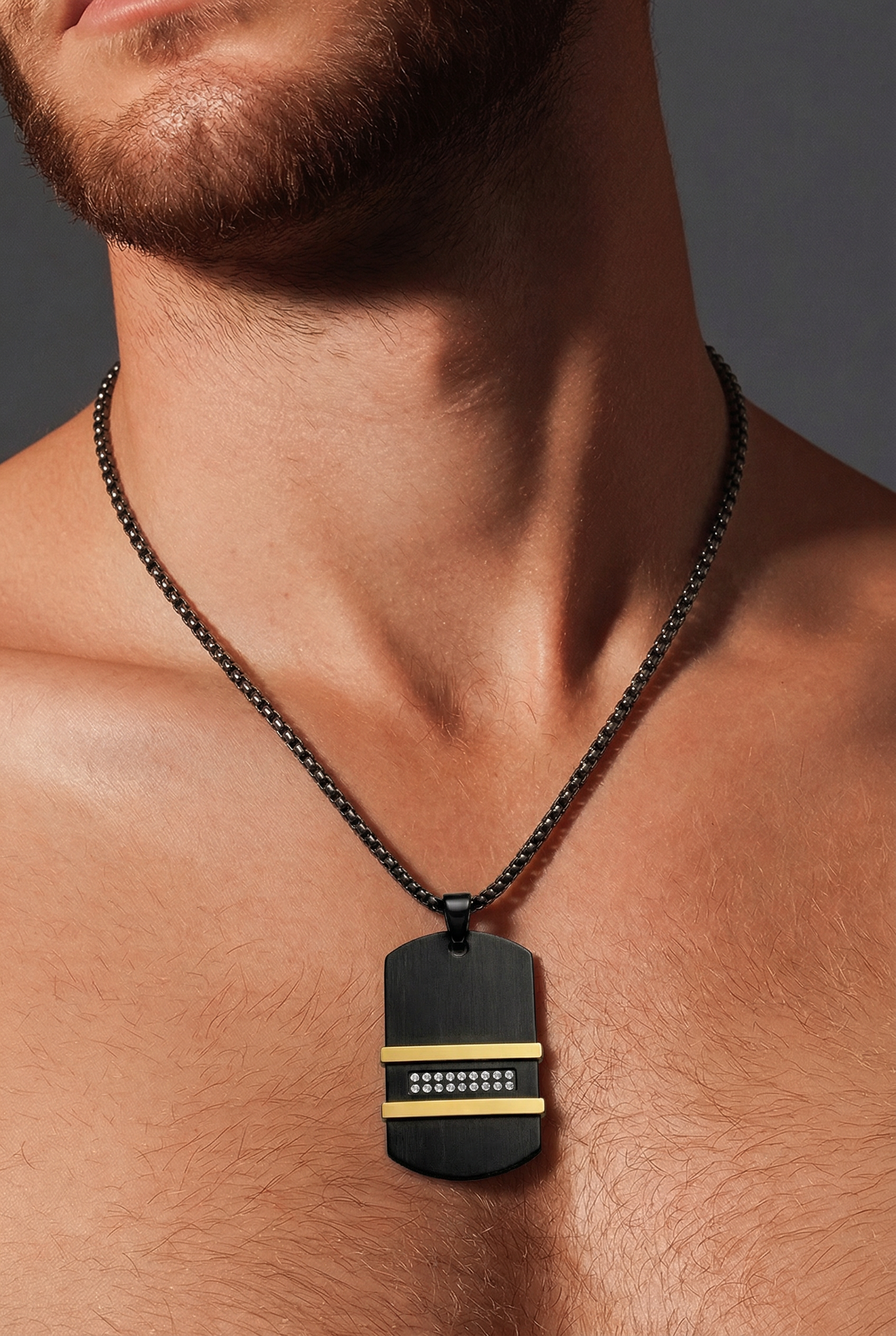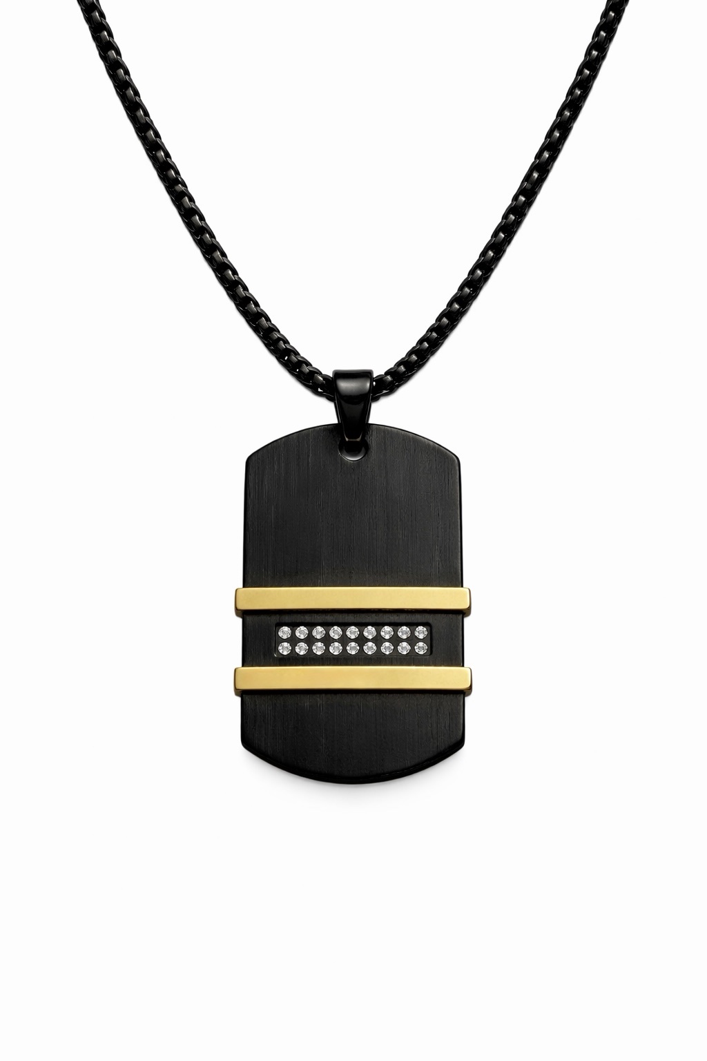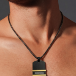 Një varëse elegante për meshkuj, e dizajnuar me kombinimin modern të black matte dhe detajeve gold, që krijojnë një pamje shumë luksoze dhe të sofistikuar. Dizajni unik me kristale të vogla në pjesën qendrore shton një shkëlqim subtil që e bën këtë aksesor të dallohet në çdo stil.