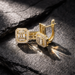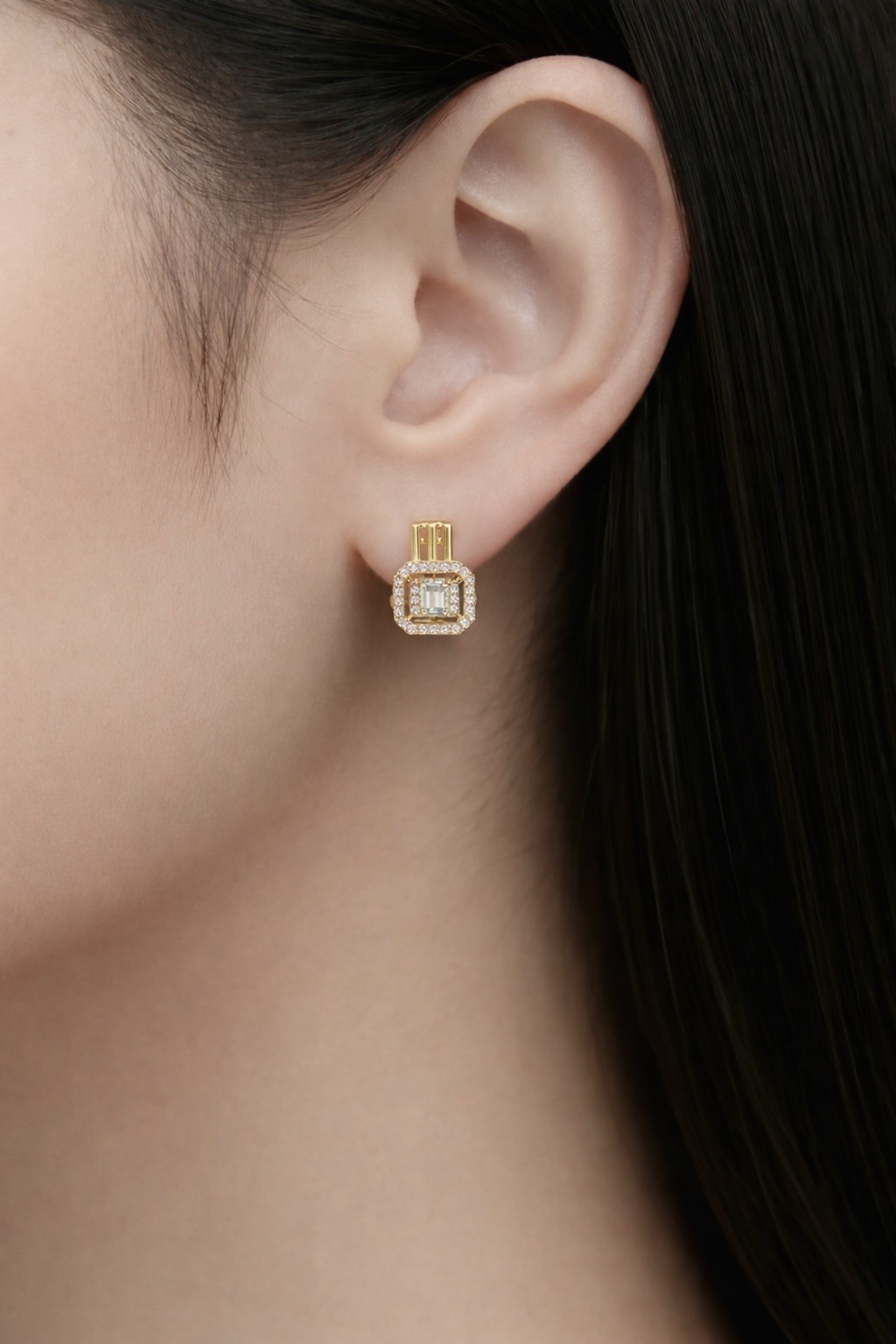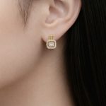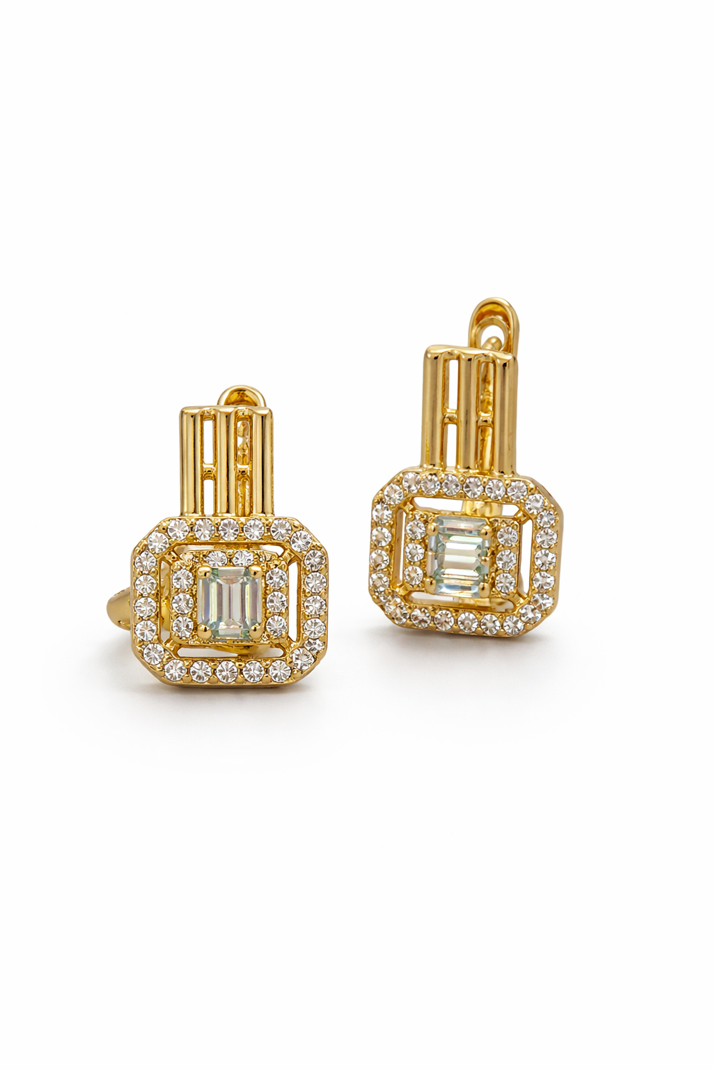 Shkëlqim maksimal dhe elegancë luksoze në çdo detaj. Këta vathë gold kombinojnë një gur qendror me prerje drejtkëndore (emerald cut) me një rreth gurësh të vegjël zirkon që krijojnë efekt halo me reflektim të fuqishëm drite.