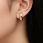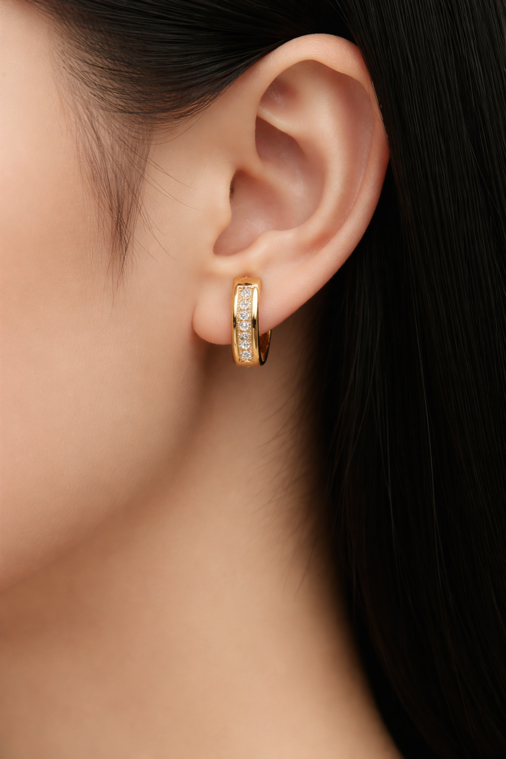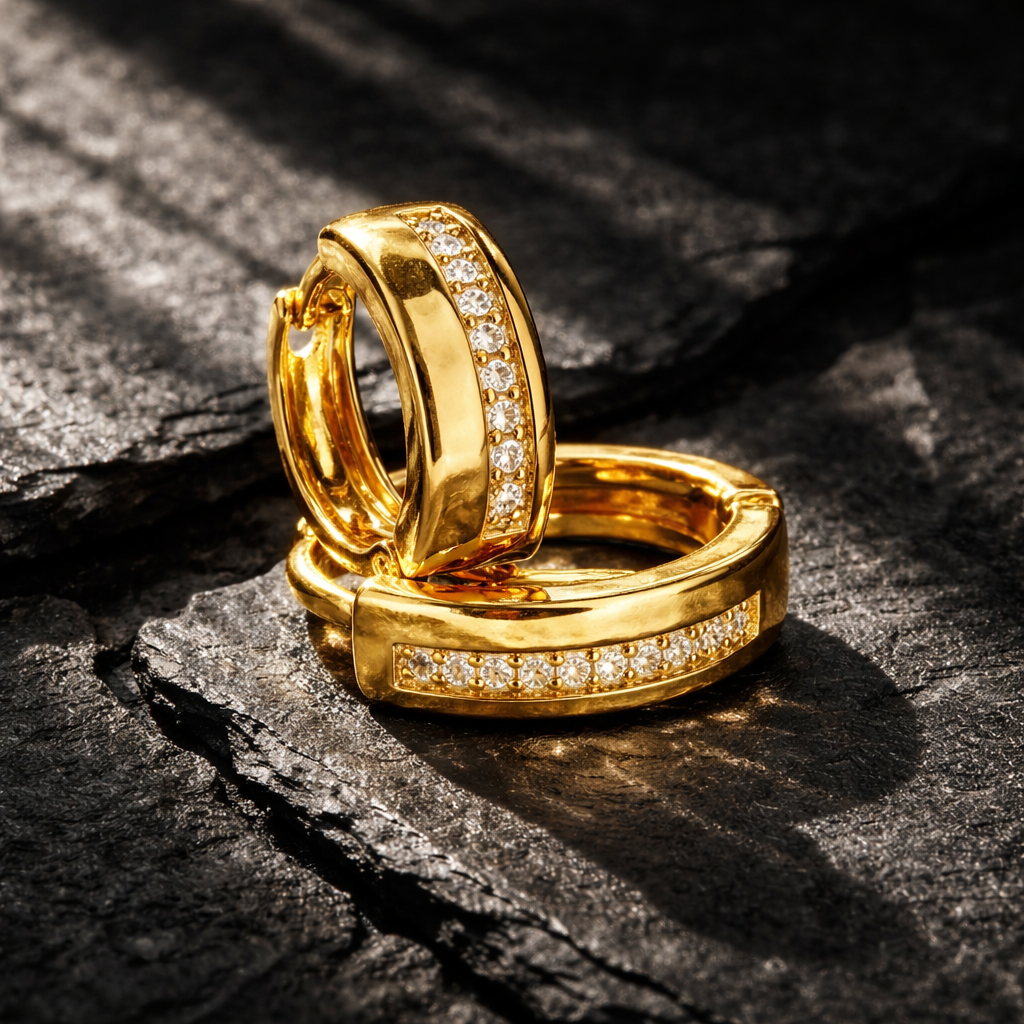 Elegancë e përditshme me prekje luksoze. Vathët nga CM Jewelry në model huggie janë të punuar me përfundim gold me shkëlqim të lartë dhe të dekoruar me rresht gurësh zirkon që reflektojnë dritën në mënyrë elegante.