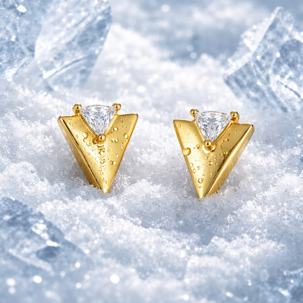 Dizajn minimalist me karakter të fortë. Këta vathë në formë trekëndëshi të përmbysur kombinojnë linjat moderne me elegancën e përfundimit gold me shkëlqim pasqyrë.