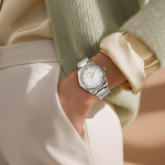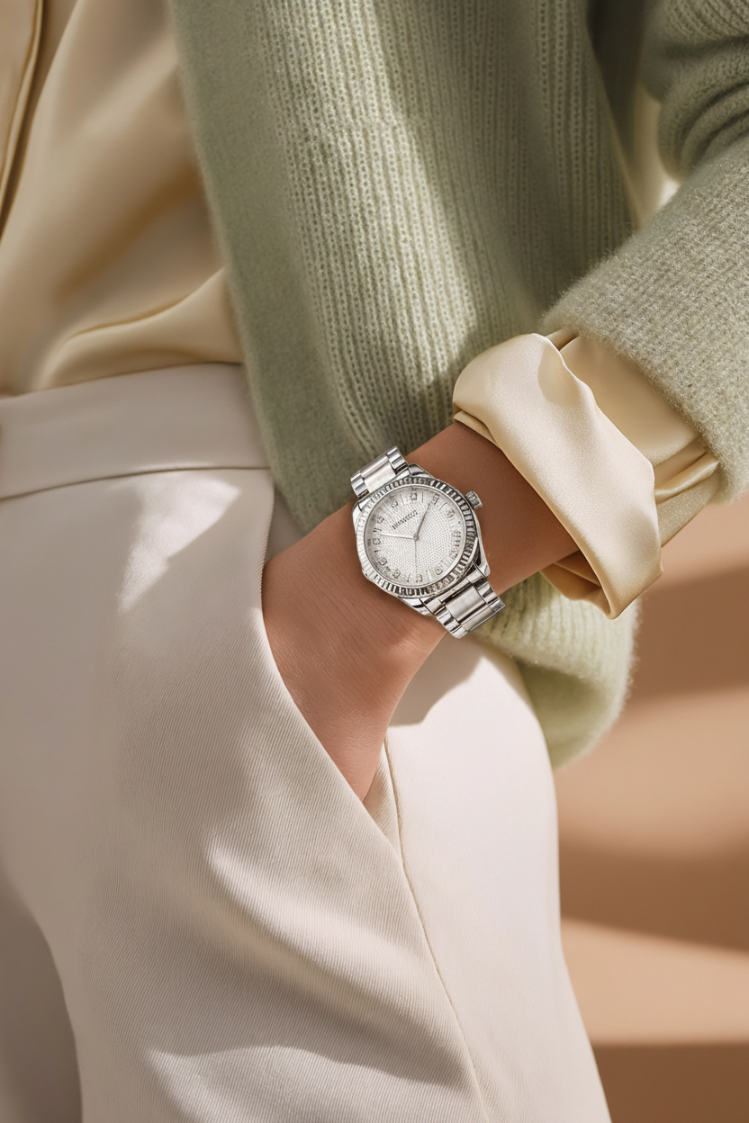 Dizajni i saj i pastër dhe elegant kombinohet lehtësisht me veshje formale apo të përditshme, duke e bërë aksesor ideal për çdo rast. Numrat romakë në cifër i japin një pamje klasike dhe luksoze, ndërsa përfundimi silver sjell shkëlqim subtil dhe modern.